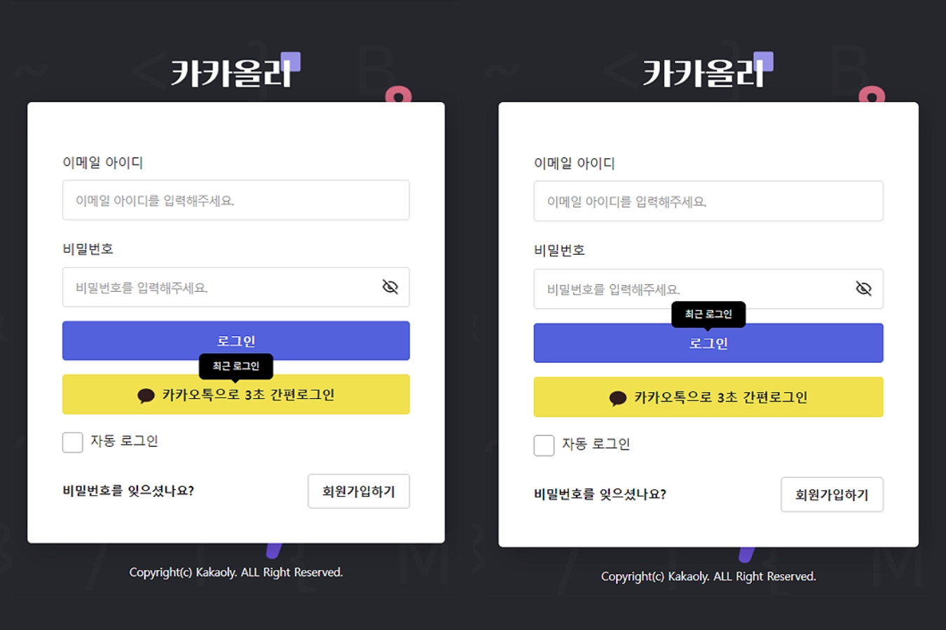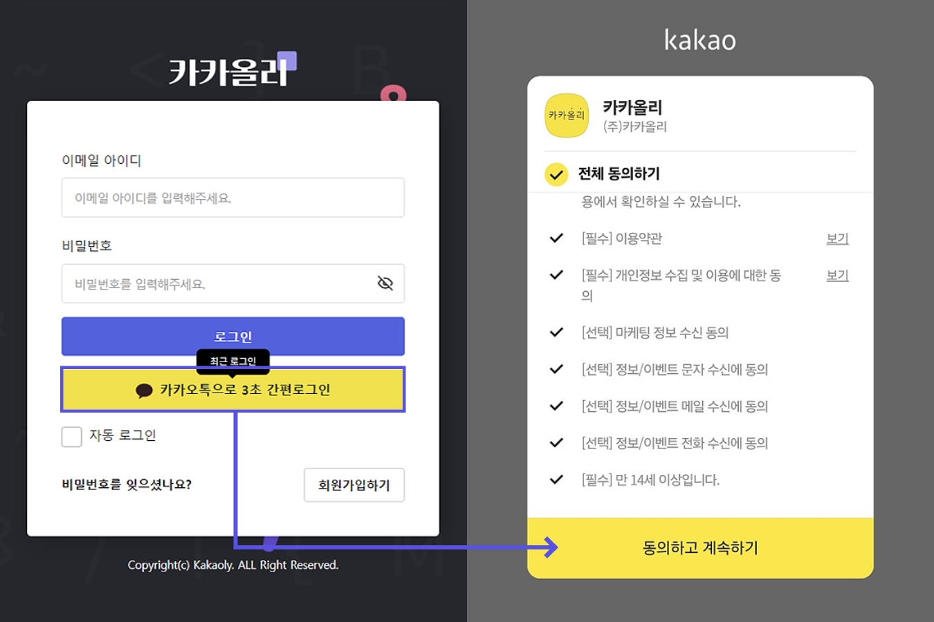 📢 이제 카카올리에서는 카카오톡만 있으면 시작부터 매끄럽게 이어집니다.