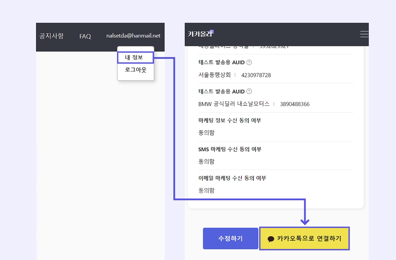 기존에 아이디/비밀번호로 가입했던 고객은 로그인 후, 내 정보 페이지에서 '카카오 연결하기'를 클릭**하면 계정 통합이 가능합니다.